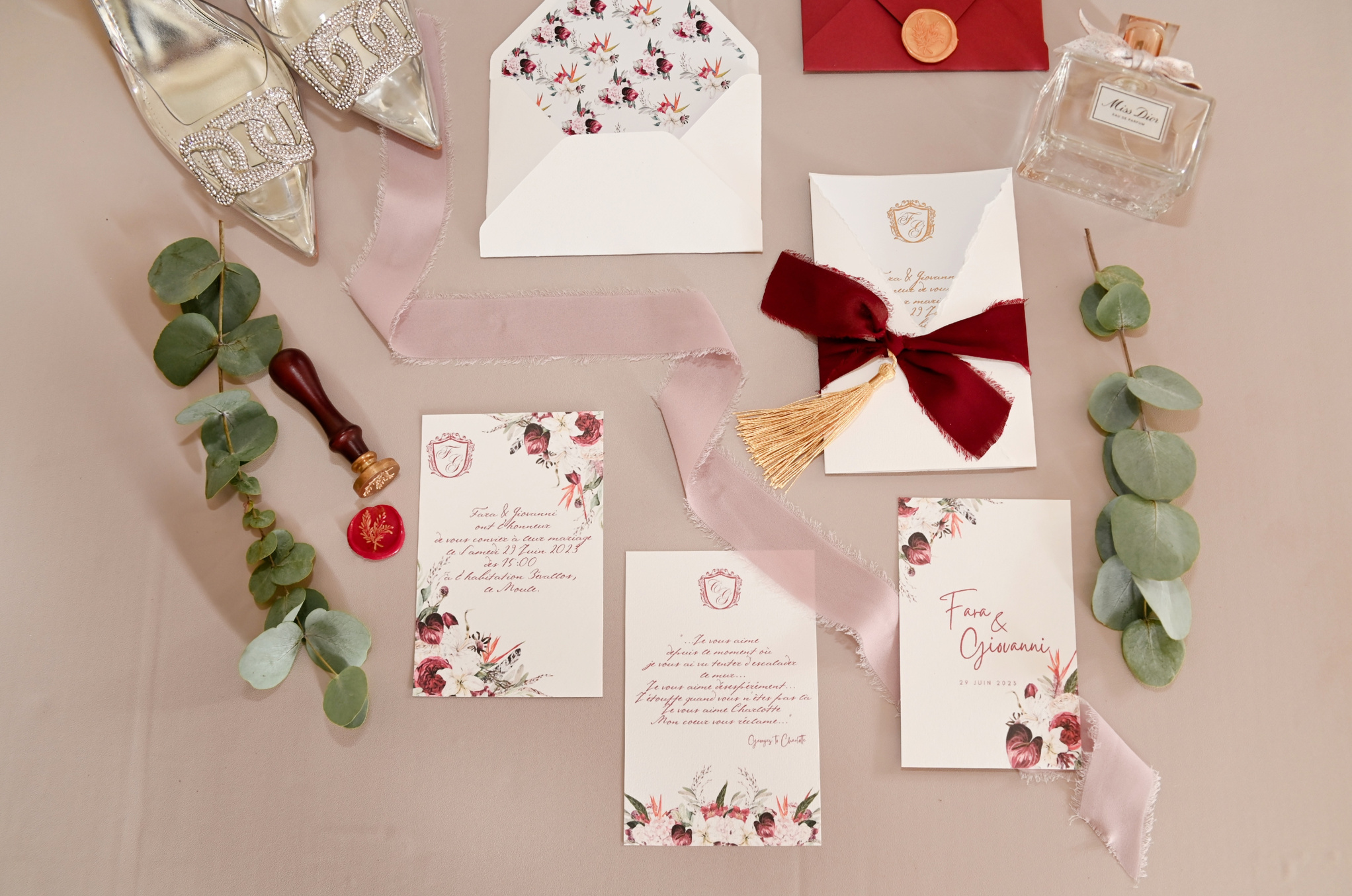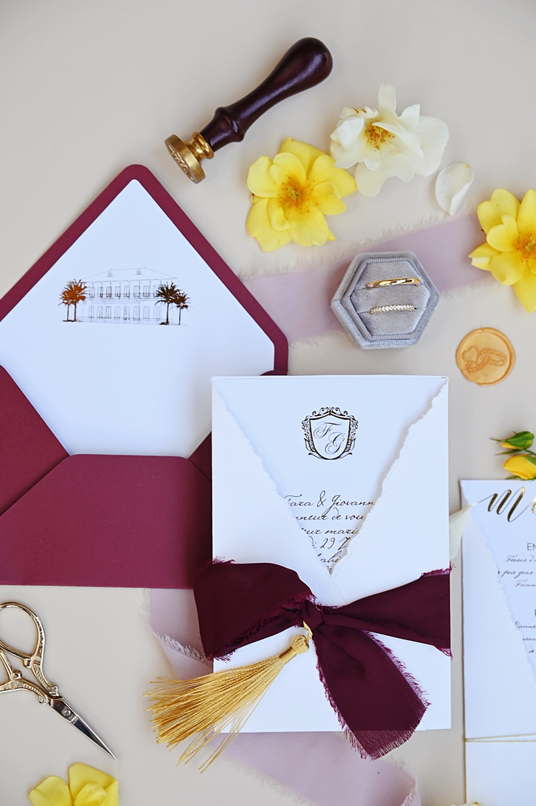 il s’agit en premier d’invitations et de faire-part mais aussi de papeterie de type cartes de menus, marques places, plan de table, cartes de remerciement,…